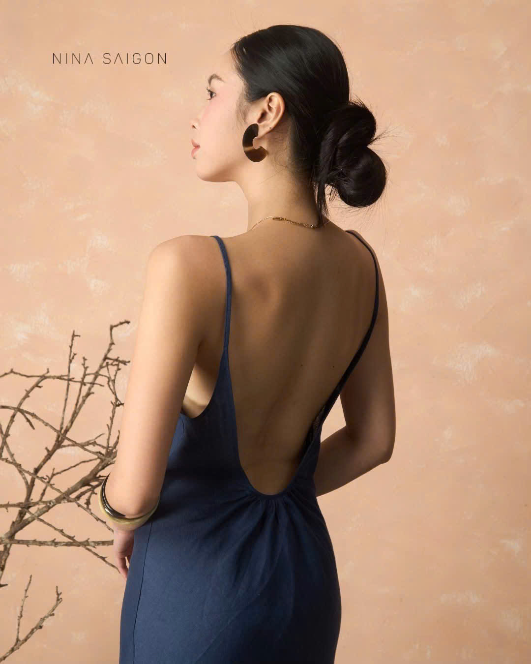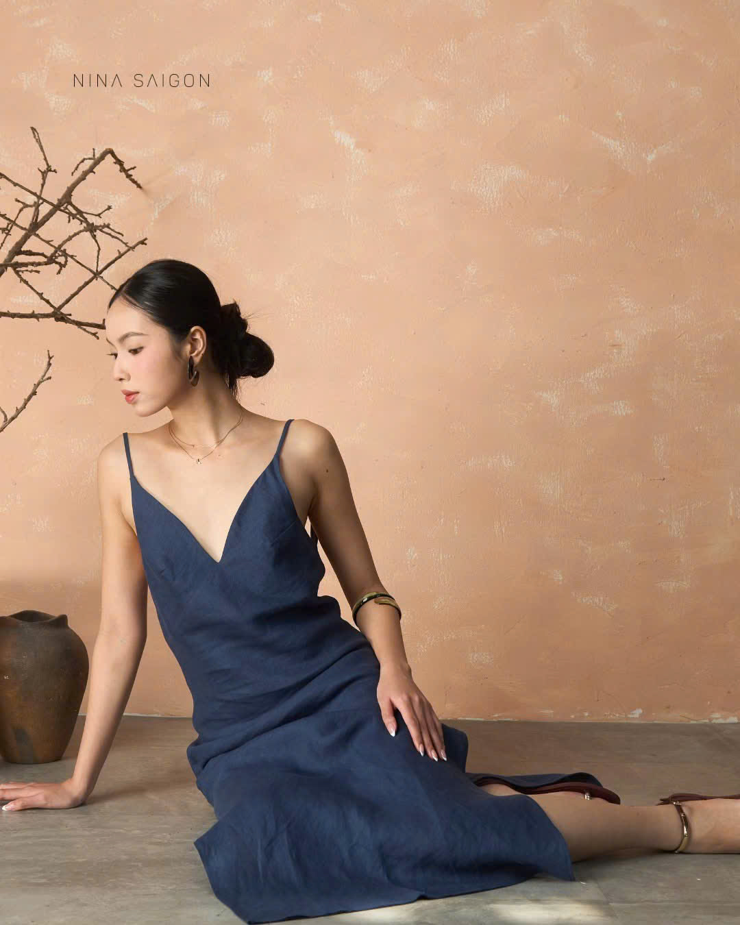 Emi được thiết kế với dây đeo chéo phía sau sử dụng kỹ thuật cắt chéo, với đường may tỉ mỉ và chi tiết khóa kéo được chế tác cẩn thận, giúp dễ dàng mặc mà vẫn giữ được sự mềm mại và uyển chuyển của vải lanh.